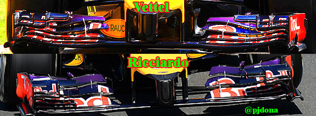 Come potete osservare dal confronto fotografico in alto, sull'ala utilizzata dal campine del mondo è stata aggiunta una soffiatura al mainplane ed è stato cambiato il disegno del profilo del flap superiore. Attraverso queste modifiche all'anteriore, l'equipe diretta da Adrian Newey, ha il chiaro obiettivo di alzare il più possibile il grosso vortice parte all'estremo interno dove c'è la soffiatura tra i flap. Gli upper flap, nella versione utilizzata da Vettel sono composti da 3 elementi. Aggiunto, inoltre, un profiletto verticale svergolato sugli upper flap in stile Mercedes