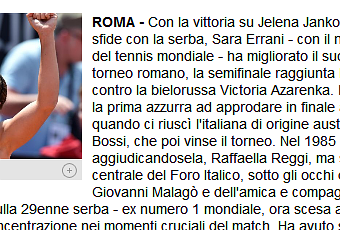 L'Italia del tennis aspettava una finale femminile al Foro Italico con una italiana in campo da 64 anni. Ci voleva queesta piccola, grande donna per darci questa emozione. Ma l'Italia del tennis al femminile oggi monopolizzerà Roma, perchè dopo la finale del singolare, Sara e sua sorella Roberta Vinci giocheranno anche la finale del doppio. Le "Sorelle d'Italia" continuano ad incantare, e le "newcomers" dovranno avere ancora un po' di pazienza...