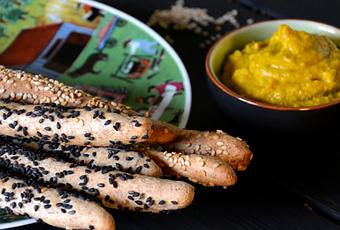 Prelevare delle porzioni di impasto, formare rapidamente dei grissini della lunghezza desiderata, bagnarli con un po' d'acqua e passarli nei semi di sesamo, fino a esaurire tutto il composto.