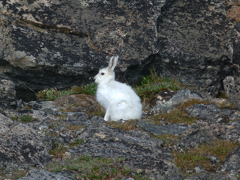 La costa est della Groenlandia è a prima vista un territorio terribilmente inospitale, la vita sembra impossibile. Eppure qua e là ci sono segni inequivocabili del passaggio di animali: una piuma, le corna di una renna, escrementi di animali che generano supposizioni tra la ciurma. Ad un certo punto una lepre bianca ci appare a pochi metri. Ci avviciniamo tutti per fare foto . La lepre ci vede ma non si muove. E’ convinta che il pelo bianco la renda invisibile. Il problema è che è seduta su pietre nerissime. Avrà comunque la reazione di scappare a gambe levate all’accorrere dei cani che tenteranno un’improbabile caccia, tornando indietro con la lingua che tocca per terra.