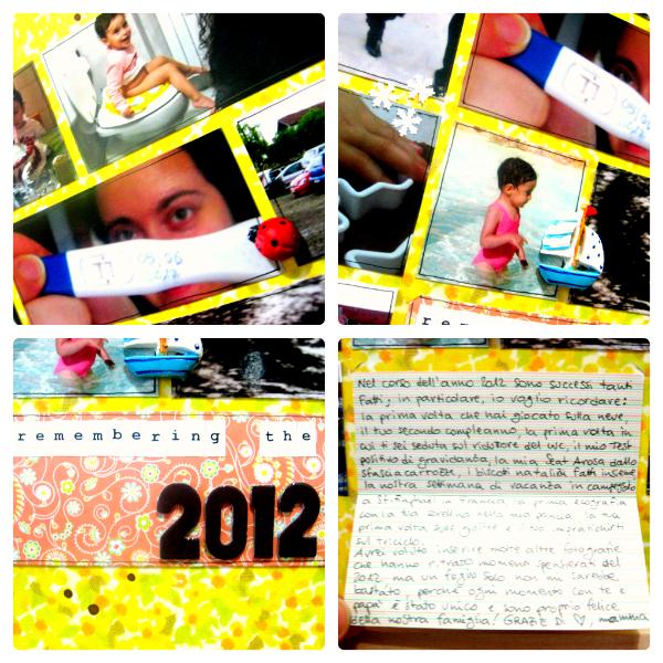 Io ho scelto un background di un colore bello allegro, per ricordare che il 2012 è stato un anno pieno di bei momenti. Non ho scelto una foto per ogni mese dell'anno, ma soltanto quelle che per me hanno rappresentato meglio i momenti fatidici del 2012. Ho utilizzato una griglia creata da me e l'ho voluta per dare risalto alle foto. Ho inserito il journaling nella casella in basso al centro, dentro ad una specie di mini card su cui ho attaccato gli alfabeti per comporre il titolo del layout. Ho attaccato qua e là alcuni embellishments adesivi (stella, barchetta, coccinella e fiocchi di neve) e ho spruzzato delle gocce di colore marrone sul background che richiamano la scritta "2012" del titolo.