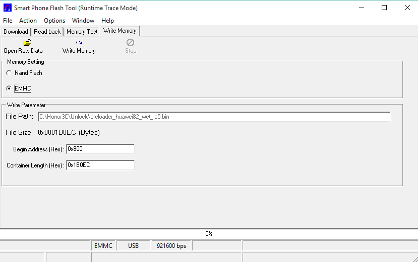 3. Dopo aver fatto ciò, spostiamoci nel tab Write Memory e clicchiamo su Open raw data. Dalla finestra che vi si aprirà, selezionate ancora una volta la sotto-cartella Unlock ed aprite il file preloader_huawei82_wet_jb5.bin. Successivamente, nella finestra che ci si apre impostiamo il tutto come nella figura che segue. ![[Guida] Aggiornare Honor 3C ad Android Lollipop 5.1 [Guida] Aggiornare Honor 3C ad Android Lollipop 5.1](http://m2.paperblog.com/i/295/2950593/guida-aggiornare-honor-3c-ad-android-lollipop-L-eDd3GL.png)