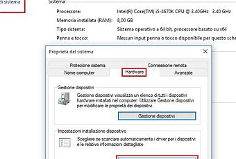 - Passiamo sulla scheda “Hardware“, quindi facciamo clic su “Impostazioni installazione dispositivo“: