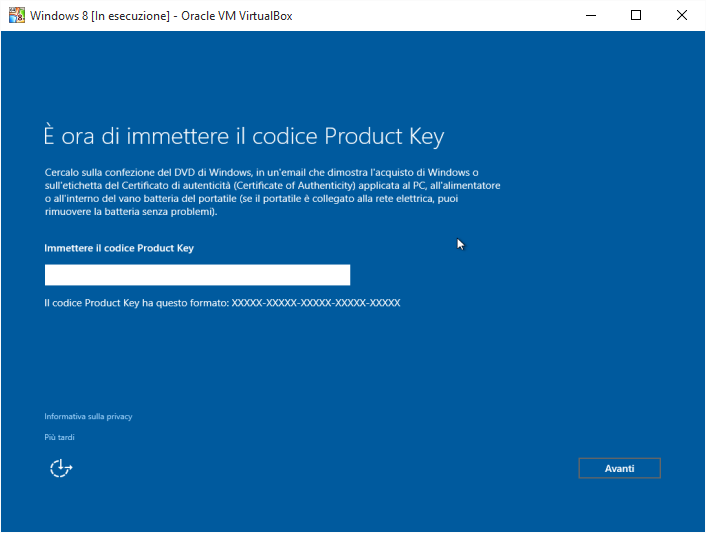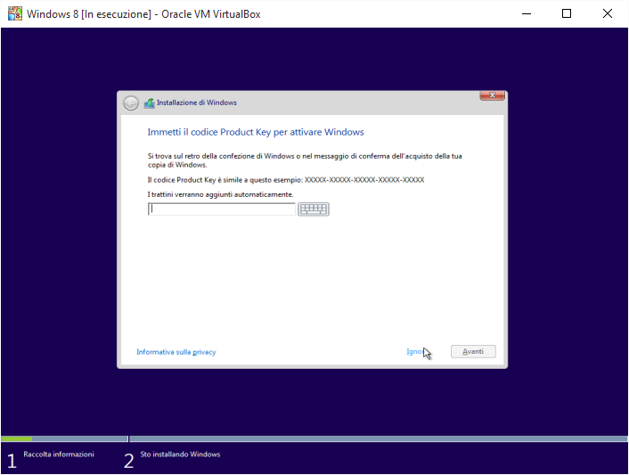 - Ora dobbiamo procedere con l’ installazione ma senza mettere il Product Key, quando ce lo chiede clicchiamo su “ignora” ed andiamo avanti.