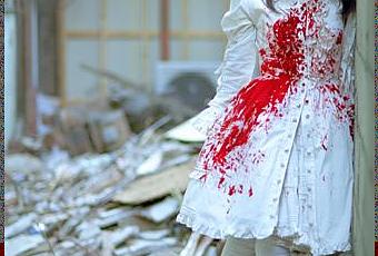 Sugli abiti bianchi il rosso del sangue risulta più evidente e tutti gli altri particolari - bende, pupazzi "vestiti" anche loro in Guro, accessori vari - contribuiscono all'effetto "bambolina appena squartata".