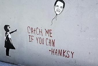 L’ispirazione è chiara, l’umorismo è personale. Lo stile di Banksy si nasconde dietro le opere del suo imitatore ufficiale Hanksy. Che sia provocazione, emulazione o altro poco importa, ciò che ci si aspetta è un duello tra i due artisti di strada a colpi di murales.
