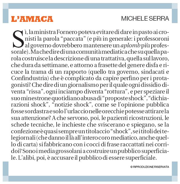 Il primo per esempio, è stato magistralmente riassunto da Michele Serra, ne L'Amaca di ieri, con tempismo profetico. L'argomento era una altro, ma il senso è lo stesso: in Italia, il MinDelLav incontra le parti sociali, e quello su cui si discute è un termine (la "paccata") che ha usato nelle dichiarazioni successive. Questo era l'altro ieri: ieri, i leader della maggioranza incontrano il Capo del Governo, e si parla della foto scattata prima dell'incontro. Prima, capite? Ma i giornalisti sono i primi ad aver capito che gente - noi italiani - hanno davanti, allora tutti ad infiocchettare la scatola: poi se dentro non c'è niente poco importa, intanto l'occhio ha avuto la sua bella parte. E poi c'è un corollario. Perché accanirsi? Capisco perfettamente che il valore giornalistico della foto, live, è altissimo. E capisco perfettamente che affrontare certe situazioni 2.0, è difficile: serve una sorta di controdifesa professionale allora? Cioè se il politico pubblica documenti su un incontro riservato, può significare la fine del giornalismo? Avete questa paura? Ma non scherziamo: anzi.