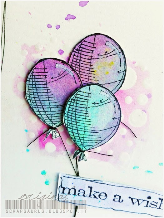 Io ho creato questa card di compleanno, per lo sfondo ho usato gli acquarelli e ho applicato del Gel 3D con lo stencil. Poi ho preso un altro cartoncino e ho ripreso gli stessi colori dello sfondo aggiungendo un pò di celeste ai toni del rosa e ho timbrato i palloncini usando l'archival ink. In questo modo ogni palloncino risulterà diverso dall'altro , ma sempre in sintonia con gli altri palloncini (ahime' colorare non è il mio forte)