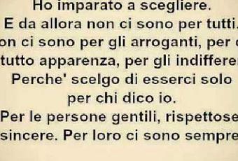 Imparate anche tutti voi a scegliere , e lasciate agli altri la falsità, l’arroganza, l’indifferenza, perchè alla fine, secondo me, ognuno ha accanto a se quel che si merita , e ognuno coglierà ciò che seminerà .