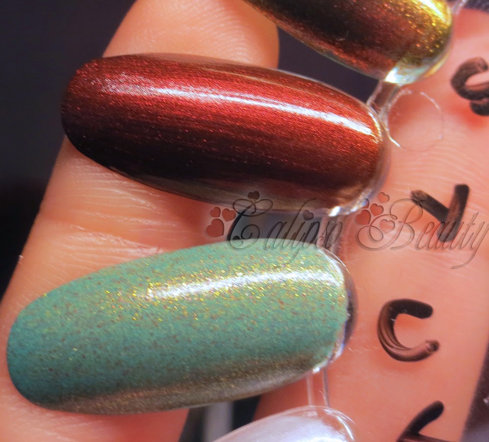 SmaltiScarab: era nella mia wishlist da moltissimo tempo. Mi piaceva l'idea di avere una tonalità così metallica nella mia collezione. Nella confezione è più rosso di come risulta sulle unghie. Nonostante sia descritto come un rosso rubino dal finish metallico, su di me tira fuori una componente marrone più visibile(vedi ultima foto) ..Dovrei provare a fare tre passate.Melange: fa parte della collezione Once, uscita recentemente. È un verde acqua scuro con micro pagliuzze oro, molto visibili anche una volta steso. Trovo che sia bellissimo e molto particolare.