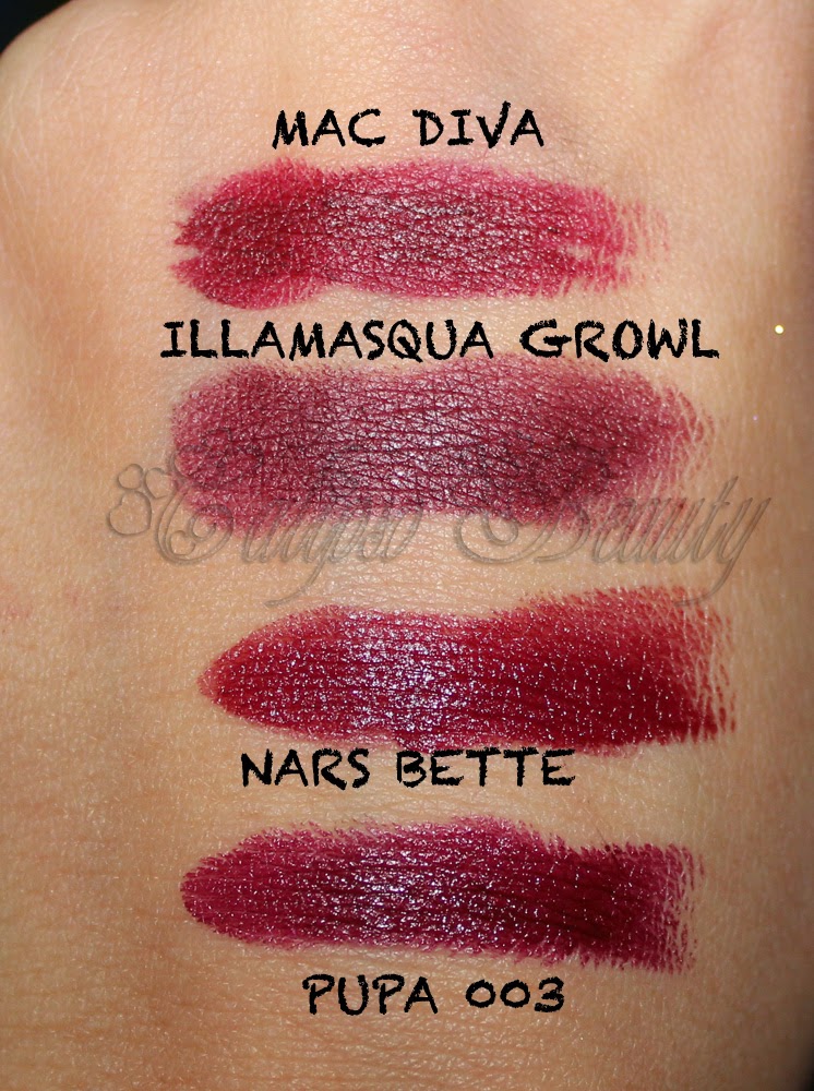Sulle labbra sembrano molto simili anche per questione di finish. Ad un occhio attento il numero 003 risulta molto più violaceo rispetto a Bette. Infatti il rossetto di Pupa è descritto come un Borgogna e non come Bordeaux.