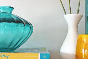 Ho scoperto che mi piace il giallo-ocra! :) Il pensile e le mensole sono una delle cose presenti prima del restyling, ma con i colori e gli arredi precedenti non era valorizzato.Ho quindi inserito dei toni di turchese con delle ceramiche e dei vasi e bicchieri in vetro.