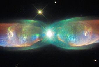 Hubble Space Telescope ci regala una nuova e straordinaria immagine: un ritratto a colori scintillanti della nebulosa Twin Jet. Lo scatto ci mostra con una capacità di dettaglio sorprendente come il gas vada espandendosi dal centro alla periferia disegnando apparentemente due gigantesche ali di farfalla. Un battito iridescente di materiali che vanno allontanandosi dal sistema centrale e composti da enormi getti di gas che si muovono a velocità superiori al milione di chilometri orari.