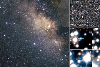 A sinistra: un’immagine ottenuta con telescopi da Terra del centro della Via Lattea. Come si vede, la vista è oscurata dalla presenza di polvere lungo il piano galattico. In alto a destra: Una piccola sezione del campo di vista di Hubble puntato sul bulge della Galassia. In basso a destra: Nei 4 campi, 4 delle 70 nane bianche scovate da Hubble, sulla base della loro temperatura, luminosità e movimento rispetto al Sole. I numeri ne indicano la posizione nel campo di vista più ampio, nel box superiore. Crediti: NASA/ESA/A. Calamida e K. Sahu (STScI) e il SWEEPS Science Team; per l’immagine da Terra: A. Fujii