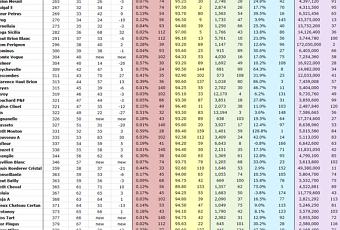 Ai primi 10 posti vini di Bordeaux con l'eccezione Domaine Romanee Conti al 5 posto; comanda Chateau Lafite Rothschild,posizione invariata rispetto ad anno precedente, secondo il Mouton Rothschild , +1, poi Chateau Haut Brion, +2, Chateau Latour, -2, poi DRC,+1, Petrus, +1, Chateau Cheval Blanc, +13, Chateau Pontet Canet, +3, e Chateau Mission Haut Brion a -2. Appena fuori dalla top ten l'Australia con il Penfolds Grange che rimane saldo all'11 posto come l'anno precedente. Il primo americano è Opus One al 25 posto con un ottimo + 11 mentre l'altra perla della Napa Valley è al 39 posto con un -1. L'Italia? Il primo degli italiani è ovviamente il Sassicaia al 27 posto, con un -6; Ornellaia al 35 con un -3; poi il Tignanello al 50 posto come new entry; Masseto al 51 posto con un'incredibile -20; Solaia al62 posto con un +3; Gaja al 63 posto con un +1; ed ultimo degli italiani Sandrone al 97 posto come new entry. Per gli Champagne il primo è Salon al 31 posto; Krug al 34 e Dom Perignon al 38. Buona la performance della Spagna con Vega Sicilia al 36, Pingus al 79 e Pesquera al 88. La tendenza dei mercati internazionali è sempre orientata verso i vini di Bordeaux con la sola eccezione del DRC della Borgogna. I vini che hanno fatto un balzo in avanti notevole sono Chateau Pichon Baron con un +42, Leoville Poyferrè con un +23 e Chateau Pichon Lalnde con un +20. Gli Italiani sono più o meno stabili a metà classifica.
