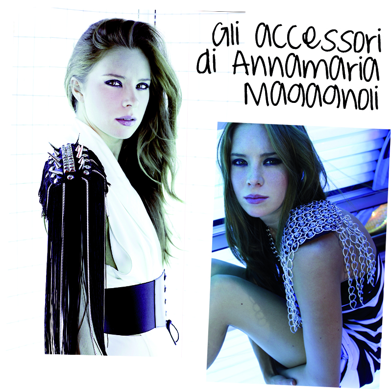 Poco tempo fa sono venuta a conoscenza delle meravigliose creazioni firmate I a.m, un marchio nato dalla creatività di Annamaria Magagnoli e non ho potuto fare a meno di inserirle nello shooting che vi ho mostrato in precedenza, scattato con Davide Cattaneo.Annamaria Magagnoli è legata alla creazione di accessori fin da bambina quando osservava mamma Carmen che fino a notte fonda confezionava oggetti con perle, catenine e pailettes per il piccolo laboratorio nel centro di Bologna. Dopo l'accademia di Belle Arti, le mostre di pittura in giro per l'Italia, la professione di Art Director per agenzie di pubblicità di prestigio, decide di esprimere la propria sensibilità artistica nella moda!Nasce Fil Rouge, la sua prima firma che le permette di vendere le sue creazioni in negozi fra Bologna, Rimini, Riccione, Repubblica di S. Marino, Milano, Torino, Roma, Napoli, Bari ed infine Londra!E adesso i nuovi orizzonti: I a.m. una collezione escluva, frizzante e glamour come Annamaria! E fanno parte di questa collezione le 2 spalline, la maschera e il bracciale che ho potuto utilizzare io stessa in questo shooting. Accessori che hanno fatto buona parte dell'intero servizio dando quella carica rock e allo stesso tempo incredibilmente femminile.