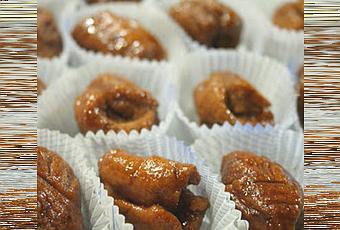 - Versare del mosto cotto (qui però si tratta di avere un amico che ha l’uva e fa il vino, sennò… non saprei come rimediarlo!!) in un pentolino, scaldare a fuoco basso e passarci i cannaricoli pochi per volta, per 1 minuto, girando bene in modo che tutta la superficie dei dolcetti venga ricoperta di mosto cotto.