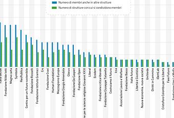Il 66% dei think tank ha almeno un membro in altre strutture . Tanti i collegamenti fra le diverse organizzazioni. Italianieuropei e la Fondazione Italia Usa le realtà con più connessioni esterne.