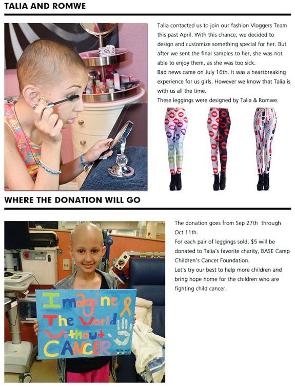 Sappiamo che Talia è con noi per sempre, non solo con la squadra di Romwe, ma anche con tutti i Romwers. Anche noi possiamo fare qualcosa per Talia e per tutti i bambini che come lei soffrono di cancro acquistando i leggins disegnati da Talia per beneficenza, il cui ricavato sarà devoluto al BASE Cancer Foundation di Talia. Si inizia il 27 settembre.