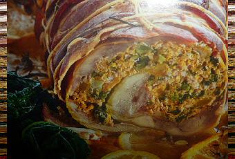 stendete la farcia sul cappone e arrotolatelo ben stretto avvolgete il rotolo con le fettine di pancetta e legare con spago da cucina