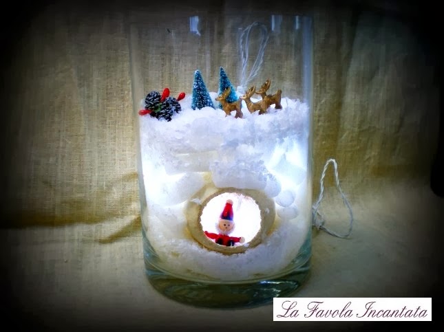 piccoli personaggi legati all’inverno e al Natalepigne, alberelli, foglie e tutto ciò che riguarda la flora invernale (potete recuperarli da vecchie ghirlande o piccoli decori per i pacchetti)neve finta (o sale) e polistirolo da imballivasi, barattoli, bicchieri, lanterne di vetrolucine di Natale.