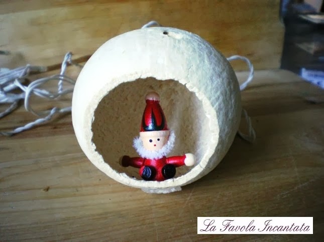 Passaggio opzionale: dal momento che volevamo che il nostro vaso fosse invernale e natalizio insieme, abbiamo pensato di inserire anche un piccolo Babbo Natale, ma abbiamo fatto in modo che fosse ancora nascosto, al calduccio di casa sua in attesa di prepararsi per la grande notte. L’abbiamo quindi posizionato in una piccola zucca (faceva parte di una composizione decorativa per vasi) che abbiamo forato nella parte superiore per inserirci una lucina.