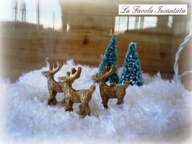 A questo punto il resto della decorazione spetta al vostro gusto e agli elementi che avete a disposizione. Noi abbiamo recuperato alcune renne in miniatura che erano incollate su piccole mollettine, le abbiamo incollate su di un cartoncino e le abbiamo posizionate nella neve, assieme a piccoli alberelli.