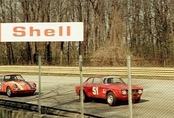 Un’ Alfa GTA del Gruppo IRI dinanzi ad una Porsche,Monza, 1964-66 circa.