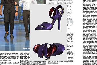 Il modello è un sandalo in pelle con tacco alto 12.5 cm e plateau interno di 1.5 cm. La forma è completata da cinturini alla caviglia e fibbia dorata e sono pensati sia in viola con interno bordeaux, sia con interno dorato a contrasto.