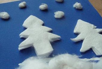 Pieghiamo a metà un dischetto e tagliamo la sagoma di metà albero; in questo modo, aprendo la parte ritagliata, otteremo un perfetto albero di pino. Realizziamone quanti ce ne servono per il nostro bosco e incolliamo con la colla liquida sul cartoncino; lasciamo che i bambini si divertano a versare la colla liquida un pò ovunque nella parte bassa del cartoncino e poi… cotone in quantità per realizzare il manto di neve che ricopre il prato. Con il classico cotone, realizziamo invece tante piccole palline arrotolando il cotone su se stesso tra le mani ottenendo così le palline di neve che andremo ad incollare spars nel cielo come se… stesse nevicando in questo momento.