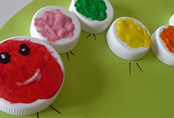 Con la punta di un dito inzzupata di colore, hanno lasciate un pò di impronte sopra ogni tappo colorandolo con i diversi colori; Simone ha poi messo un pò di colla liquida dietro i singoli tappi per poi attaccarli sulla foglia, uno dietro l’altro in fila indiana. Con un pennarello dalla punta sottile, ho disegnato le zampette e disegnato 2 grandi occhi sul primo tappo; che ne dite? Secondo me è molto carino ed il primo di tanti lavoretti dedicati alla Primavera e spero che possa essere di buon auspicio per una splendida Primavera.
