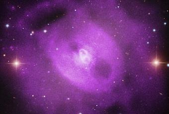 Immagine composita del gruppo di galassie NGC 5813. In violetto le riprese nei raggi X del telescopio spaziale Chandra della NASA che mettono in evidenza tre coppie di cavità nel gas caldo che permea questo oggetto celeste.