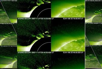 Le riprese di un getto coronale avvenuto il 21 novembre 2007 e osservato dalla sonda STEREO-B. Nella colonna di destra, la sequenza presa dallo strumento EUVI, in quella di sinistra dal coronografo COR1, dove è ben visibile la deflessione del getto dovuta alle linee del campo magnetico solare. Crediti: STEREO/NASA/G. Nisticò/ U. Warwick