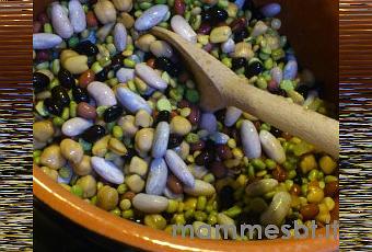 I legumi vanno tenuti a bagno per una notte in ciotole separate. Al momento di cuocere il tutto si procede facendo appassire la cipolla con dell’olio extra vergine d’oliva, si aggiungono i legumi (il mais a fine cottura), l’acqua e il sale e si lascia cuocere per almeno 40 minuti. Visto che i legumi hanno tempi di cottura diversi questi andrebbero aggiunti uno alla volta in base al tempo di cottura di ognuno… io a volte non ho tempo e così cuocio tutto insieme anche perchè non mi dispiace sentire che qualche fagiolo è rimasto più croccante rispetto agli altri legumi ;-)