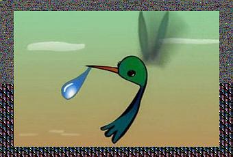 L’unico a non fuggire è un piccolo colibrì che in volo, con una goccia d’acqua nel suo becco, non solo non si allontana ma penetra all’interno della fitta vegetazione con l’intento di riuscire, se ce la fa, a spegnere il fuoco che divampa.