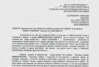 Il 4 settembre scorso abbiamo inviato tramite PEC al Comune di San Giorgio del Sannio (nr prot. 16663) una istanza volta a richiedere azioni relative all'abuso dei giochi con vincite in denaro e una connessa proposta di adesione al Manifesto dei Sindaci per la legalità contro il gioco d’azzardo.Oggi il Sindaco ed il Presidente del Consiglio Comunale ci hanno inviato una nota in cui ci viene comunicato che l'argomento sarà discusso in un apposito Consiglio Comunale convocato al fine di stilare un documento e predisporre un'azione di contrasto al fenomeno nonché di chiedere una legge regionale e statale per ridurne e contenerne l'offerta e l'accesso, in uno con un'azione di prevenzione dai rischi del gioco d'azzardo.Auspichiamo vivamente che i buoni propositi dell'amministrazione comunale non rimangano tali e che ci sia un reale e concreto impegno contro il gioco d'azzardo patologico.
