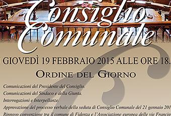 2. Comunicazioni del Sindaco e della Giunta. 3. Interrogazioni e Interpellanze. 4. Approvazione del processo verbale della seduta di Consiglio Comunale del 21 gennaio 2015. 5. Rinnovo convenzione tra il comune di Fidenza e l’Associazione europea delle vie Francigene (relatore assessore Gruzza). 6. PRG. - Variante al piano urbanistico attuativo di iniziativa privata per attività produttive denominato "Rio Bergnola/Tangenziale Nord“. Controdeduzione. Approvazione .(relatore assessore Castellani).