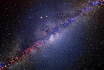L’immagine mostra i traccianti per la determinazione della curva di rotazione applicata ad una foto della Via Lattea vista dall’emisfero sud. I colori, codificati in blu e rosso, indicano il moto relativo rispetto al Sole. L’alone sferico blu illustra la distribuzione della materia oscura dedotta dall’analisi dei dati. Credit: Serge Brunier / NASA