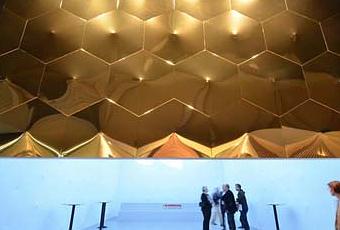 Il padiglione è un cubo di 12 metri per lato, alto 7 metri, che all’esterno ha l’aspetto di un favo, grazie a una serie di pannelli riflettenti in Barrisol dorato. All’interno, l’atmosfera è completamente diversa, ci si trova in una camera totalmente bianca, ottenuta con la copertura in Barrisol del soffitto e delle pareti. La luce diffusa e il perfetto isolamento acustico all’interno del padiglione immergono il visitatore in una sorta di viaggio negli abissi dell’oceano. Ambientazione ideale per gli oggetti luminosi dalle forme organiche creati da Lovegrove con Barrisol© e illuminazione a Led.