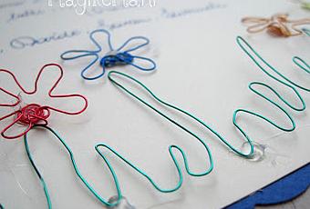 Quindi un bel prato volutamente stilizzato (il tutto doveva sembrare quasi uno schizzo) fatto con il filo verde,dei bei fiori colorati, modellati appunto con il filo di rame sottilissimo (troppo)...