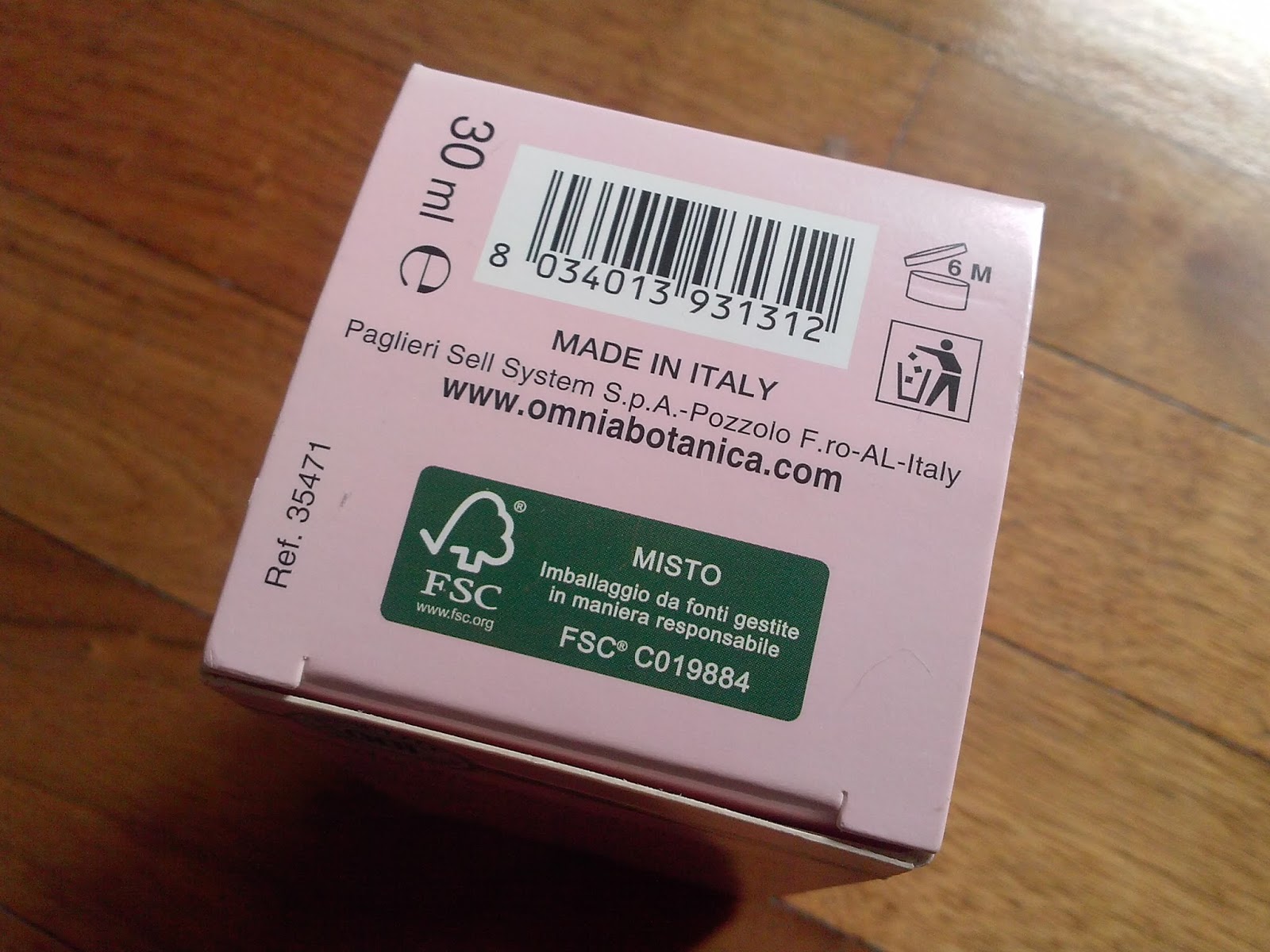 Per quanto riguarda i dati tecnici, che sono riportati anche sul tubetto stesso, di modo che se si butta la confezione esterna non ce li si "dimentica" (*applausi* a Omnia Botanica), sono pochi e semplici: 30 ml di crema con PAO 6 mesi, e chi si è visto si è visto. Non è riportato l'inci sul tubetto, ma non è questo grande problema secondo me. A proposito di questo, all'inizio non l'ho guardato manco per sbaglio (sbagliato, molto sbagliato), perchè confidavo negli ingredienti naturali, ma devo dire che sono davvero contenta di aver comprato questa crema, perchè davvero non ho mai visto tanti bollini verdi in una volta (lasciamo stare gli allergeni da profumo, che alla fine fanno poco o niente)!