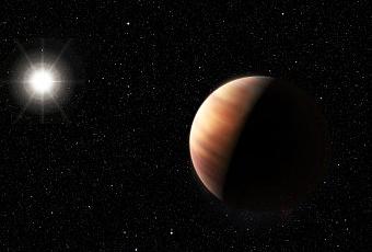 Questa rappresentazione artistica mostra il nuovo gemello di Giove, un gigante gassoso in orbita intorno al gemello del Sole, HIP 11915. Il pianeta ha una massa simile a quella di Giove e orbita a una distanza dalla sua stella simile a quella tra Giove e il Sole. Crediti: ESO/M. Kornmesser