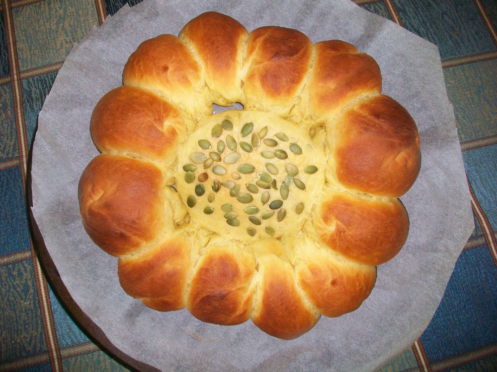 Spennellare il disco centrale con il latte e distribuirvi i pistacchi (io semi di zucca).