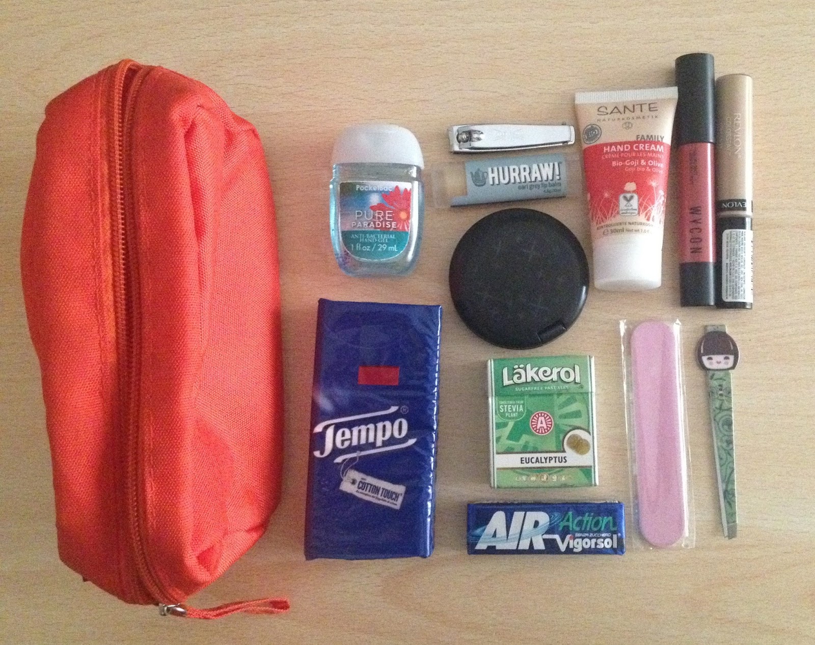 Innanzitutto un accessorio che inizialmente snobbavo, ma rivelatosi poi stracomodo, è il cuscinetto gonfiabile per il collo, mi permette di dormire (o almeno, di provarci) senza rischiare torcicolli ed altri allegri acciacchi. Ho sempre con me una pochettina con caricabatterie per il telefono ed iPod, sia per ascoltare un po di musica, si per collegare le cuffie allo smartphone per vedere qualche video senza disturbare; ma il pezzo, per me, davvero indispensabile è il Kindle, con cui mi assicuro ore di sano intrattenimento letterario - e devo ammetterlo, il Paperwhite (quello retroilluminato) è ancora più comodo perchè non si ha nemmeno bisogno di accendere lucine varie, la visibilità è perfetta anche al buio. Infine, naturalmente, una bottigliozza d'acqua, anche perchè spesso gli autisti mettono il riscaldamento dell'aria su temperature tropicali, e l'aria secca dopo un po' si fa sentire. Preferisco usare una borraccia perchè posso lavarla e riempirla a piacimento rispetto alla normale bottiglia in PET da gettar via. Gli snack non li ho fotografati, ma in genere ceno prima di partire e faccio poi colazione al mattino all'arrivo, quindi un po' di frutta o poco altro sono più che sufficienti, anche perchè mangiare e far briciole in pullman non mi piace troppo ;D Ognuno ha le sue fisime!Indispensabile, poi, è un piccolo assortimento pseudo-beauty, che del resto in gran parte è quello che ho sempre con me in borsa, ovvero una pochette con: