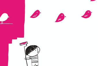 Il libro bianco Incomincia, nemmeno a dirlo, con due belle pagine bianche, poi compare, sull’angolo in basso a sinistra, un bimbetto dal caschetto nero tratteggiato a carboncino con in mano un rullo da imbianchino. Sembra riflettere, l’espressione è seria e concentrata; al voltar pagina si manifesta un bel sorriso di soddisfazione e nel margine sinistro anche una striscia di colore fucsia. Il bambino continua a colorare la parete e su quella base fucsia da lui stesso creata compaiono degli uccellini, uccellini che da appisolati divengono sognanti e si librano in volo macchiando di rosa lo spazio bianco e lasciando le loro sagome bianche laddove è già fucsia, in un divertente gioco d’alternanza di vuoti e pieni.