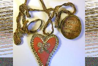 L’immagine, Segnale di Antonio Maria, è tratta dall‘Archivio di Stato di Prato: “fettuccia di fili in vari colori con breve a forma di cuore in stoffa verde da un lato e rosa dall’altro con ricami e orlatura in metallo; con medaglione ovale contenente reliquie.”