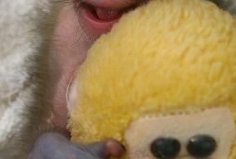 Il piccolino, bellissimo e tenero, stringe a se un pupazzo con le fattezze di una scimmietta... quasi fosse un suo fratellino.