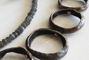 Ormai da qualche mese avevo realizzato degli elementi in rame, che mi soddisfacevano moltissimo, ma che volevo montare non utilizzando la catena, che secondo me ne avrebbe sminuito la forza. E così mi sono affidata alle pietre, belle e piccole rondelle di labradorite sfaccettata dai metallici riflessi blu.