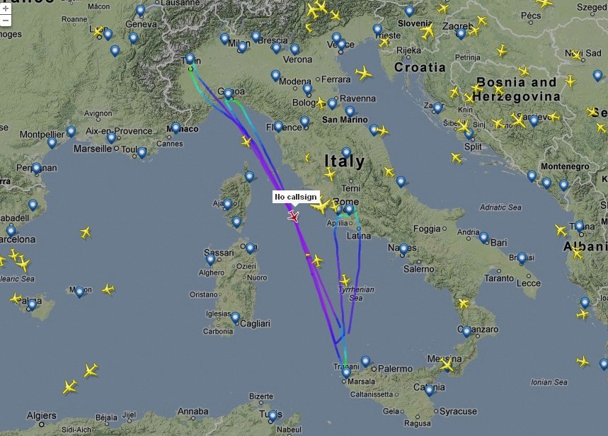 Intanto sono sempre pià fequenti voli fantasma come questo, sorpreso a percorrere in lungo ed in largo lo stivale senza un piano di volo e senza ideintificativo. E' chiaramente un volo clandestino notturno preposto alla dispersione di neurotossici metalli in atmosfera. Commossi, ringraziamo.