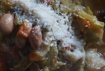 Ho già scritto che il minestrone non mi piace, quello classico intendo, a me piace quando ci sono poche verdure, niente di amidaceo e soprattutto ci deve essere la verza. Tantissima verza....e un po' di pomodoro, che gli dona quel gusto acidulo che adoro nel minestrone. E' così che, quando mi hanno regalato del minestrone già preparato, sono andata a prendere apposta una verza bella rugosa e croccante e ne ho aggiunta al minestrone. Lavata e fatta a pezzi con le mani, chiuso la pentola a pressione, 7 minuti dal sibilo, una bella girata e il mio minestrone verzoso è pronto.Una striscia di formaggio, una C di olio extra vergine di oliva, il tempo delle foto che lo porta a temperatura umana. Ottimo.